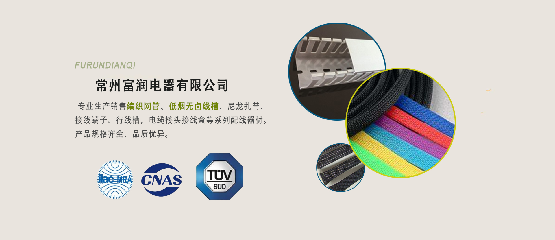 常州富潤電器有限公司專業生產、銷售編織網管、尼龍扎帶、接線端子、行線槽,電纜接頭接線盒等系列配線器材···